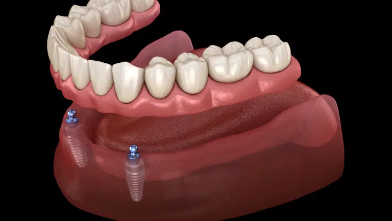 For patients missing many or all of their teeth, implant retained or implant supported dentures may be an alternative to traditional dentures. These solutions can simulate the look and feel of natural teeth and stay fixed in place with the implants acting as anchors. Using implants for retention or the support of dentures allows for a smaller and more comfortable base and less shifting of the prosthesis during use.